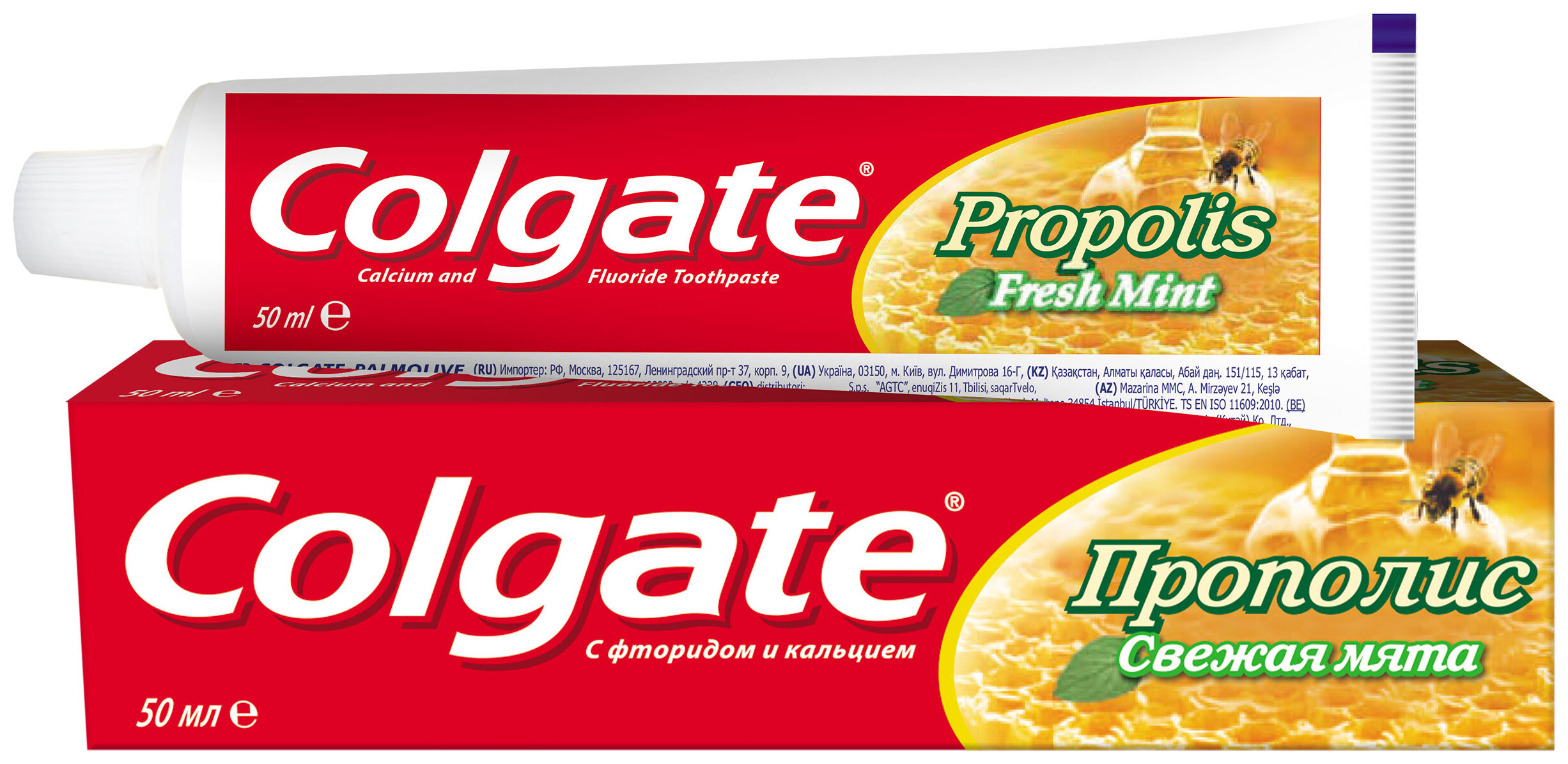 • Зубная паста Colgate® Прополис Свежая мята с экстрактом прополиса cочетает в себе кальций, активный фтор и прополис.