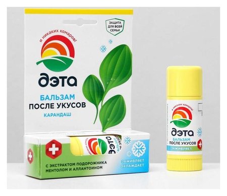 Бальзам после укусов «Дэта» эффективно снимает зуд и болевые ощущения после укусов насекомых, ожогов крапивы и медуз. Уменьшает отечность, способствует исчезновению покраснения. Благодаря экстракту подорожника бальзам обладает противовоспалительными и заживляющими свойствами. Аллантоин успокаивает кожу, а ментол дает приятный охлаждающий эффект.