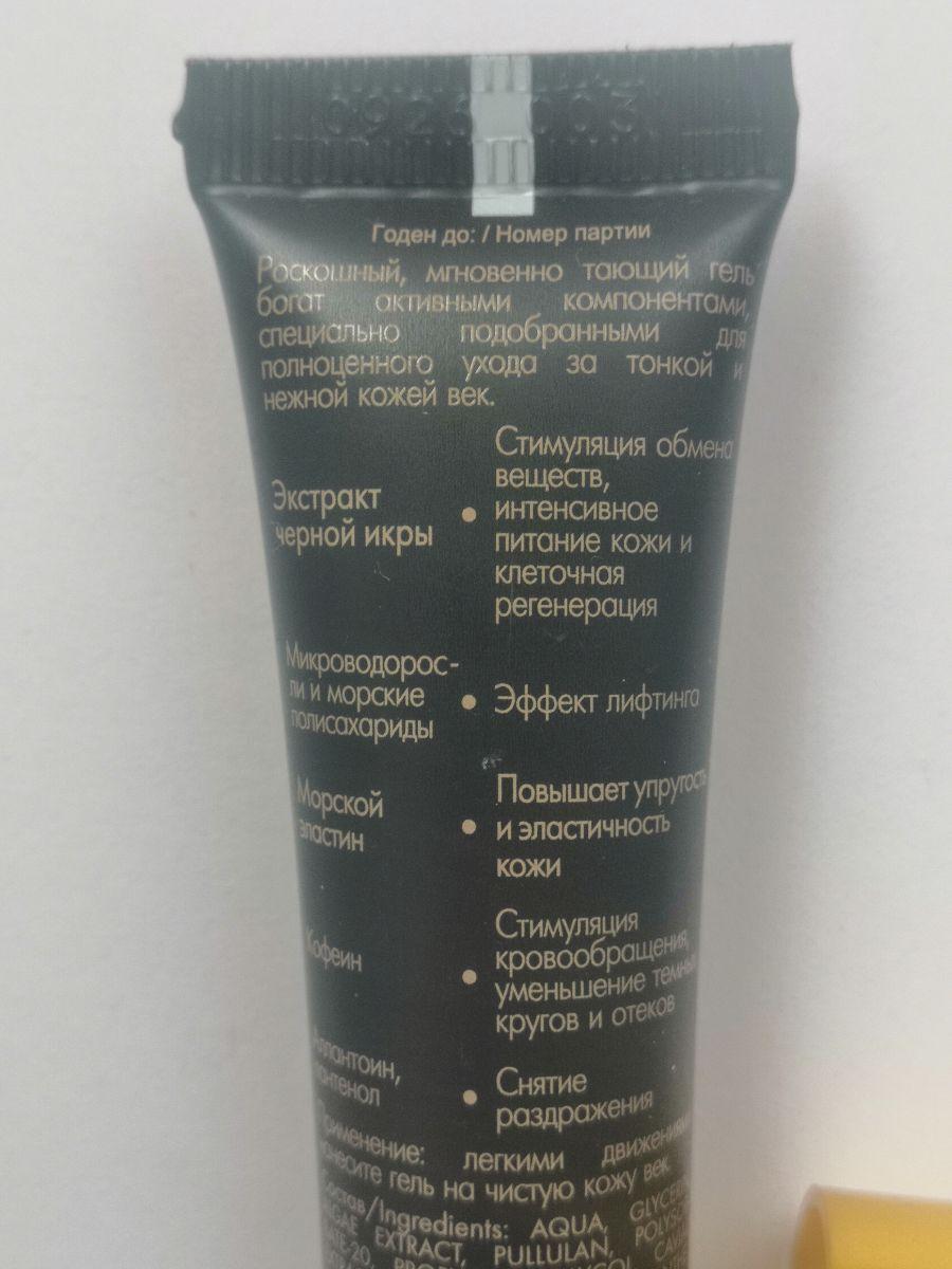 Активные компоненты: комплекс на основе черной икры, лифтинг-комплекс микроводорослей и полисахаридов, морской коллаген и эластин, кофеин, аллантоин, пантенол.