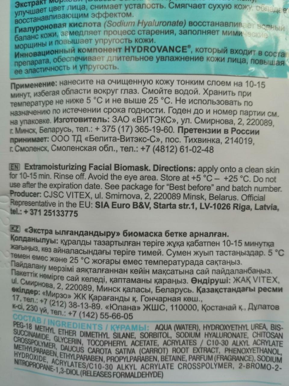 Отзывы на Биомаска для лица Экстраувлажнение Белита - Витекс