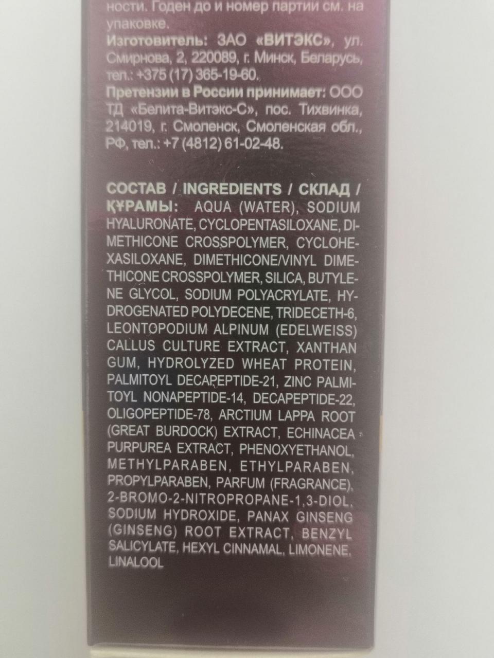 Вода, гиалуронат натрия, циклопентасилоксан, кроссполимер диметикона, циклогексасилоксан, полиакрилат натрия, гидрогенизированный полидецен, тридецет-6, кроссполимер диметикона/винилдиметикона, диоксид кремния, бутиленгликоль, эктракт культуры недифференцированных клеток Leontopodium Alpinum (эдельвейса), ксантановая камедь, гидролизованный белок пшеницы, пальмитоилдекапептид-21, цинковая соль пальмитоилдекапептида-14, декапептид-22, олигопептид-78, экстракт Echinacea purpurea (эхинацеи), экстракт корня Panax Ginseng (женьшеня), феноксиэтанол, метилпарабен, этилпарабен, пропилпарабен, парфюмерная композиция, 2-бром-2-нитропропан-1,3-диол, гидроксид натрия, альфа-изометилионон, бензилсалицилат, бутилфенилметилпропиональ, цитронеллол, гексилциннамаль, лимонен, линалол.