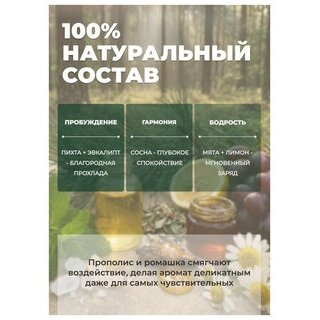 Прохлада пихты и эвкалипта пробуждает, аромат сосны наполняет спокойствием, а мята с лимоном дарят мгновенный заряд бодрости.