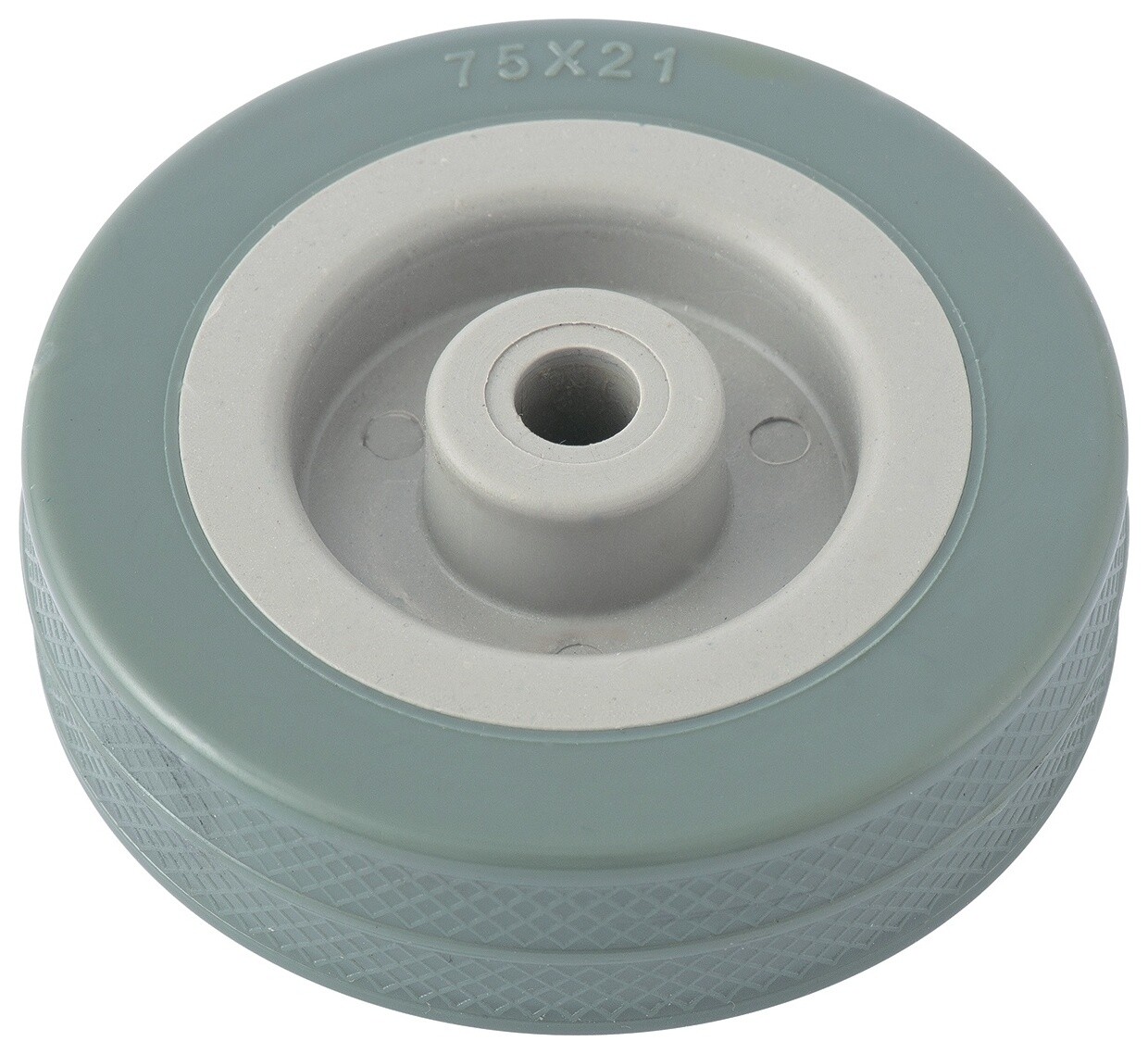 - Контактная поверхность выполнена из термопластичной серой резины, поэтому колесо может применяться на различных покрытиях, долгое время сохраняя рабочие качества.