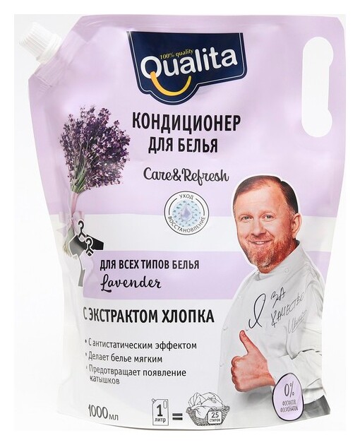 Устраняет статическое электричество и облегчает глажение. Придает приятный аромат. После использования кондиционера на поверхности одежды остается дополнительный защитный слой. Экстракт хлопка способствует укреплению ткани.