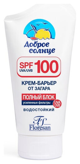 Floresan Крем-барьер от загара Полный блок Водостойкий. 125 мл с усиленным комплексом UVA/UVB фильтров эффективно защищает кожу от солнца и борется с пигментацией, вызванной воздействием УФ лучей. Особенно эффективен в случаях с повышенной склонностью к пигментации кожи, с непереносимостью или аллергическими реакциями на солнце.