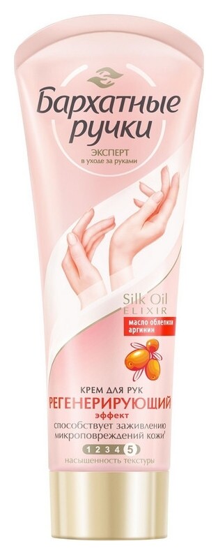 "Крем для рук Бархатные ручки регенерирующий 80 мл. Крем разработан специально для кожи рук, требующей особого интенсивного ухода. Компоненты в составе крема активируют восстановление клеток, обеспечивая профилактику появления мелких трещинок. Кожа рук ежедневно испытывает колоссальное воздействие разрушающих стресс-факторов. Регулярное применение крема для рук, не менее 2-х раз в день, восполняет ресурсы кожи, защищая ее от микроповреждений. Формула Silk Oil Elexir представляет собой комплекс, состоящий из микромасел и протеинов шелка. Благодаря своему размеру (до 10 мкм), эти частицы масел способны проникать внутрь эпидермиса, не нарушая липидный барьер, и доставлять питательные вещества клеточкам кожи. Масло облепихи укрепляет стенки кровеносных сосудов и делает их менее проницаемыми, улучшает тканевой обмен веществ, обладает антиоксидантным действием. Аргинин - это аминокислота, способствующая клеточному делению, служит строительным материалом для производства белков. Аргинин необходим для синтеза креатина. Глицерин оказывает смягчающее действие на кожу, увлажняет ее. Небольшие по размеру молекулы глицерина способны преодолевать липидный барьер кожи и проникать в глубокие слои эпидермиса. Мочевина - увлажняющий компонент, подходит для сухой, чувствительной кожи. Способ применения: наносите крем на чистую, сухую кожу легкими массирующими движениями. Состав: Aqua, Glycerin, Urea, Dimethicone, Zea Mays (Corn) Oil, Polyglyceryl-3 Methylglucose Distearate, Caprylic/Capric Triglyceride, Cetearyl Alcohol, Glyceryl Stearate, Prunus Amygdalus Dulcis (Sweet Almond) Oil, Cyclopentasiloxane, Acrylates/C10-30 Alkyl Acrylate Crosspolymer, Butyrospermum Parkii (Shea Butter), Allantoin, Arginine, Caprylyl Glycol, Dimethyl Sulfone, Disodium EDTA, Ethylparaben, Hippophae Rhamnoides Fruit Juice, Hippophae Rhamnoides Oil, Hydrolyzed Silk, Methylparaben, Niacinamide, Phenoxyethanol, Potassium Sorbate, Potassium Cetyl Phosphate, Parfum, Alpha-Isomethyl Ionone, Benzyl Salicylate, Butylphenyl Methylpropional, Citral, Citronellol, Hexyl Cinnamal, Limonene, Linalool."