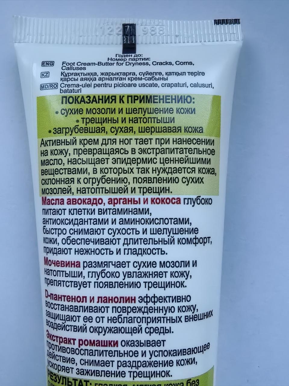 активный крем для ног тает при нанесении на кожу, превращаясь в экстрапитательное масло, насыщает эпидермис ценнейшими веществами, в которых так нуждается кожа, склонная к огрубению, появлению сухих мозолей, натоптышей и трещин.