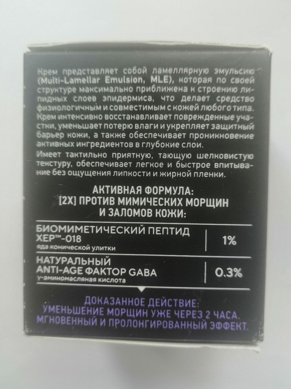 Aqua (water), glycerin, ethylhexyl cocoate, dicaprylyl ether, behenyl alcohol, glyceryl stearate, potassium cetyl phosphate, hydrogenated palm glycerides, cyclopentasiloxane, cyclohexasiloxane, mu-conotoxin cniiic, sodium lactate, sodium pca, glycine, fructose, urea, niacinamide, inositol, sodium benzoate, lactic acid, isostearyl isostearate, coco-caprylate/caprate, propylheptyl caprylate, aminobutyric acid, creatine, vitis vinifera (grape) seed oil, olea europaea (olive) fruit oil, argania spinosa kernel oil, plukenetia volubilis seed oil, sodium acrylates copolymer, lecithin, tocopheryl acetate, parfum, sodium hyaluronate, methylparaben, propylparaben, disodium edta, 2-bromo-2-nitropropane-1,3-diol, benzyl salicylate, hexyl cinnamal, linalool, limonene, hydroxycitronellal.