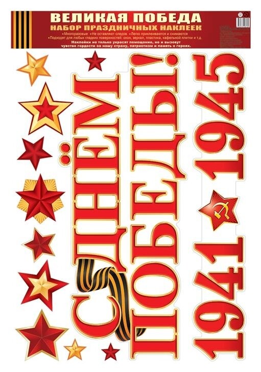 Комплект с вырубными наклейками предназначен для оформления любого интерьера, посвященный 75-летию Великой Победы. В комплект входит несколько вырубных элементов. Из элементов можно составить на поверхности разные композиции, применив свою фантазию. Чем больше использовать элементов, тем будет более интересная и насыщенная композиция, которая создаст патриотический дух, а также сохранит память о тех далеких и трудных временах.Эти замечательные украшения легко приклеиваются на стены, мебель, двери, окна, прочие поверхности и снимаются, не оставляя следов на поверхности.
