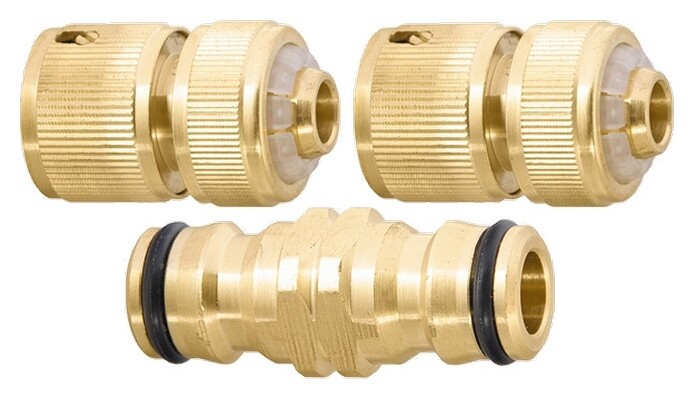 Набор соединителей для шлангов изготовлен из латуни. Применяется для наращивания длины шланга и подключения шланга к системе полива. В набор включены два соединителя, один из которых оснащен механизмом «автостоп» для автоматического прекращения подачи воды. Посадочные диаметры деталей набора совместимы со всеми адаптерами, быстросъемными соединителями, тройниками, разбрызгивателями латунной и пластиковой серии Palisad.