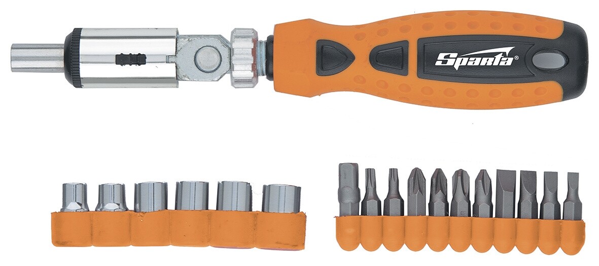Отзывы на Отвертка реверсивная с шарниром, биты, торцевые головки, 18 шт Sparta