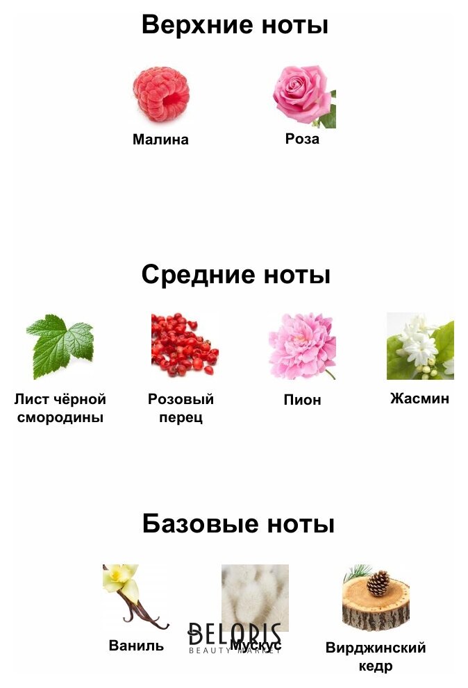 - Верхние ноты: Малина и роза — сочный дуэт сладости и цветочной элегантности, словно первый поцелуй под луной.