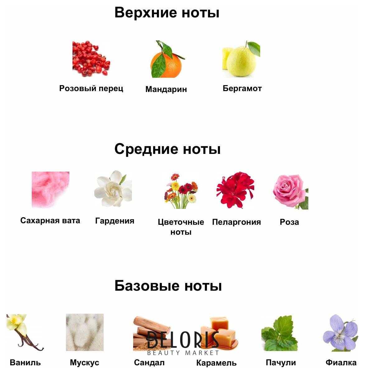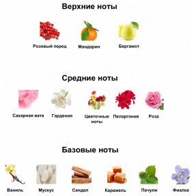 - Сердце аромата: Сахарная вата и гардения встречаются с цветочными нотами пеларгонии и розы, добавляя сладости, нежности и загадочной глубины.