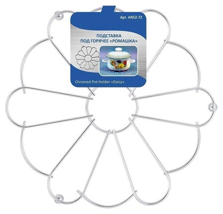 На любой кухне происходит приготовление пищи, сервировка стола, подача блюд и т.п. Довольно часто приходится иметь дело с горячими предметами: мисками, кастрюлями, сковородами и т.п. Обезопасить поверхность стола, скатерти или клеенки можно с помощью специальной подставки под горячее «Ромашка». Изделие изготовлено из стальной хромированной проволоки, имеет миниатюрные ножки для устойчивости. Стильная подставка может использоваться для повседневных нужд и на праздниках. Диаметр 20 см.