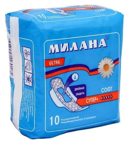 Прокладки женские Милана Ультра Софт Супер + - ультратонкие прокладки для критических дней. Удлиненная форма (260мм) обеспечивает увеличение впитываемости. Впитывающий слой "Айрлайт"-прессованная целлюлоза с добавлением гранул геля, для фиксации жидкости внутри прокладки. Впитывающий слой надежно закреплен термическими швами, что фиксируют на месте гранулы геля и не позволяют им собираться в комки. Верхний слой - мягкое покрытие СОФТ, не вызывает аллергии и раздражения. Снабжены гибкими крылышками увеличенного размера для надежной фиксации и защиты белья.