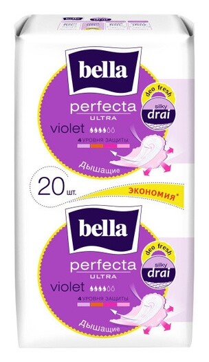 Ультратонкие прокладки bella Perfecta ultra Violet подарят ощущение комфорта и уверенность в любой ситуации. Они имеют толщину всего 2 мм, но гарантируют надежную защиту во время критических дней, и незаметны даже под обтягивающей одеждой. Боковые крылышки и 3 клеящих полосы обеспечивают надежную фиксацию к белью. Нежное и шелковистое покрытие-сеточка silky drai моментально впитает влагу, оставляя поверхность сухой, а декоративное тиснение дополнительно помогает равномерному и быстрому впитыванию жидкости, которую надежно удерживает суперабсорбент предотвращая появления запаха.
