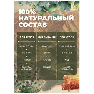 Воск пчелиный, экстракт маклюры, барсучий жир, экстракты мяты, душицы, чабреца, лимонника, камфоры, зверобоя, живицы, девясила, эфирные масла эвкалипта, сосны, скипидар живичный, масла расторопши, рыжиковое, ментол, витамин Е, мёд кавказский.
