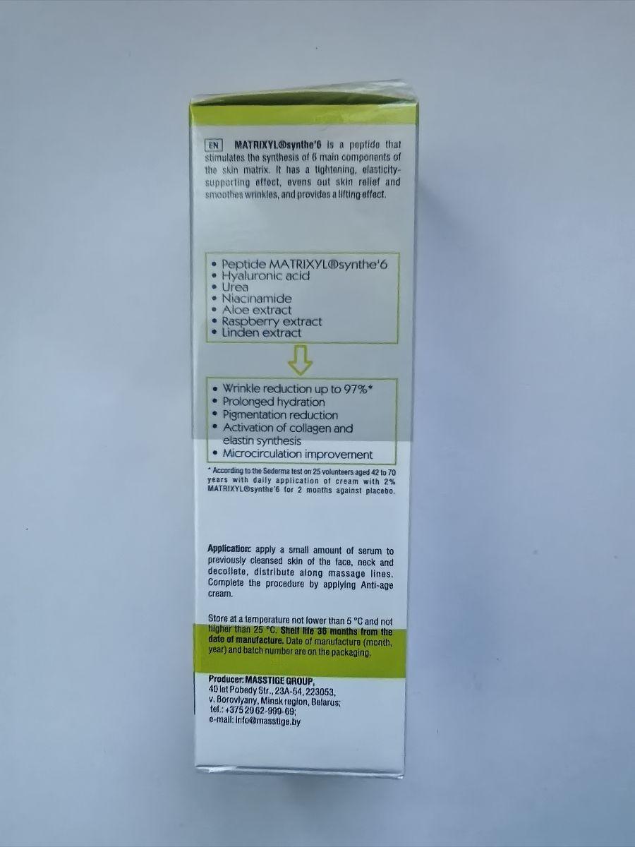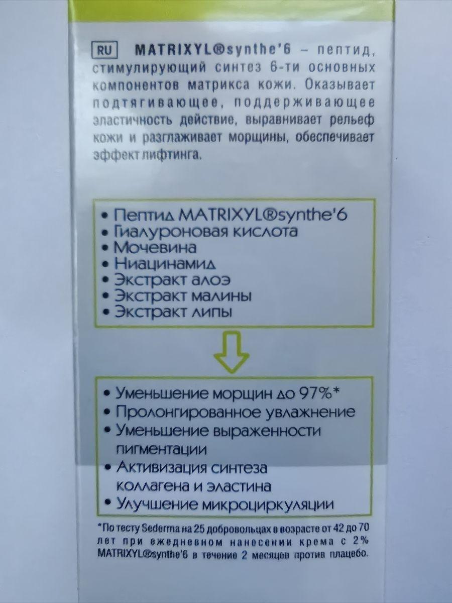 Активные компоненты: гиалуроновая кислота, MATRIXYL synthe'6, мочевина, ниацинамид, экстракт алоэ, экстракт малины, экстракт липы, TENS'UP™.