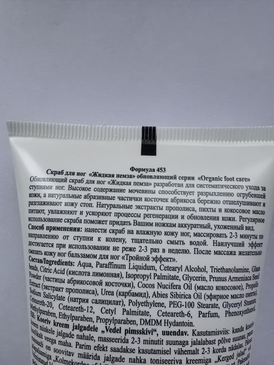 Кожа ног нуждается в постоянном уходе. Благодаря правильному уходу можно надолго сохранить молодость ног, их привлекательность и красоту. Скраб для ног «Жидкая пемза» обеспечивает глубокую очистку, размягчает и увлажняет даже самые грубые участи кожи ног. Порошкообразные микрочастицы «жидкой пемзы» бережно отшелушивают поверхностные клетки кожи, делая ее мягкой и гладкой. Прополис и пчелиный воск имеют высокие защитные свойства, глубоко питают, длительно поддерживая эластичность и упругость кожи. Эффективность действия скраба усиливается в сочетании с другими средствами серии «Organic foot care».