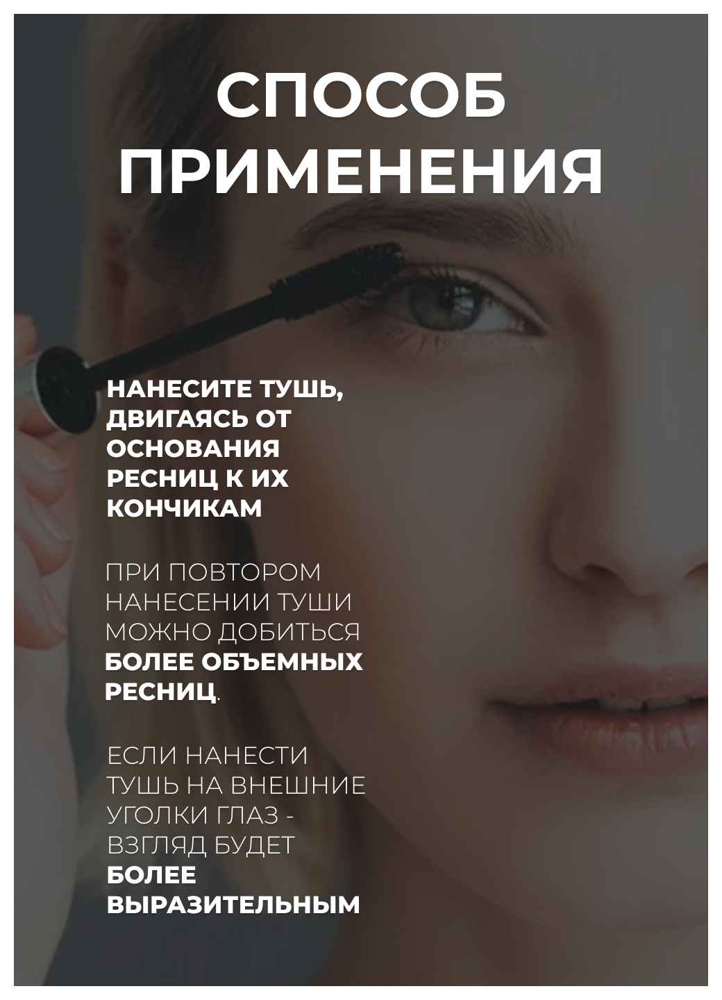 Наносите от корней ресниц, покачивая щеточкой аппликатора и проводя ею вверх вдоль ресниц.