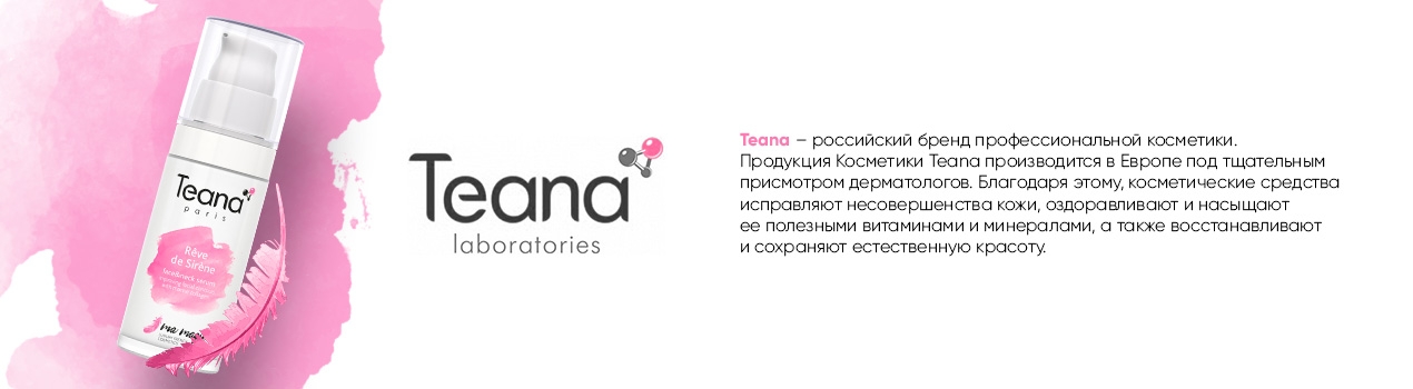 Teana это российский бренд профессиональной инновационной косметики. Основные производственные площади компании Teana находятся в России (в наукограде Юбилейном) и во Франции на побережье Бретани. На этих двух площадках производятся лабораторные образцы, тестируются финальные продукты и готовятся к выходу в свет уникальные новинки. Компоненты для производства косметики компания Teana закупает в Великобритании, Франции, Марокко, Германии, Швейцарии. Используемые ингредиенты представляют собой высококонцентрированные действующие вещества, которые возможно получить из растений только путем сложных технологических процессов. Отсутствие лишних примесей и высокая концентрация — гарантия того, что они будут оказывать прогнозируемый и выраженный эффект. Впервые косметика Teana появилась на российском рынке в уже далеком 2007 году. Именно тогда был выпущен первый продукт - ампулы с пятью видами сывороток. Это эксклюзивное, не имеющее аналогов концентрированное средство, бьющее точно в цель, было встречено с восторгом и вдохновило компанию на создание новых эффективных инновационных косметических продуктов, помогающих женщинам поддерживать и сохранять естественную красоту. Сегодня Teana - один из наиболее динамически развивающихся российских косметических брендов, тщательно отслеживающий и внедряющий все последние достижения в области косметологии и постоянно обновляющий линейку продуктов.